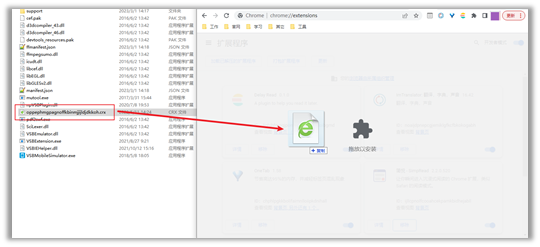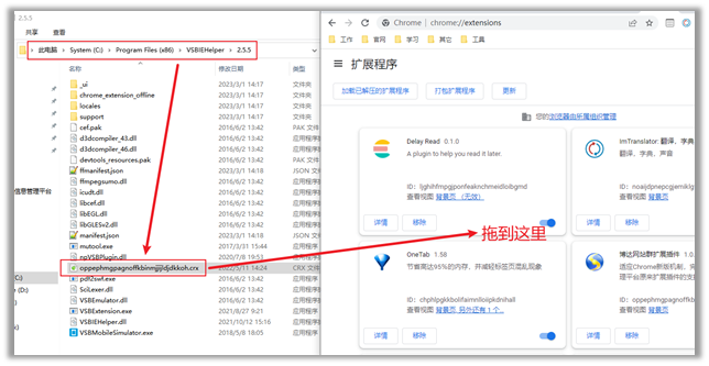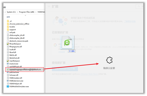 5.3与Chrome浏览器一样,打开资源管理器,进入文件夹【C:\Program Files (x86)\VSBIEHelper\2.5.5】,将【oppephmgpagnoffkbinmjjijldjdkkoh.crx】文件拖到扩展管理中(注意是鼠标选中后按住左键不放进行拖动),当扩展管理界面显示【拖放以安装】时,松开鼠标左键即可